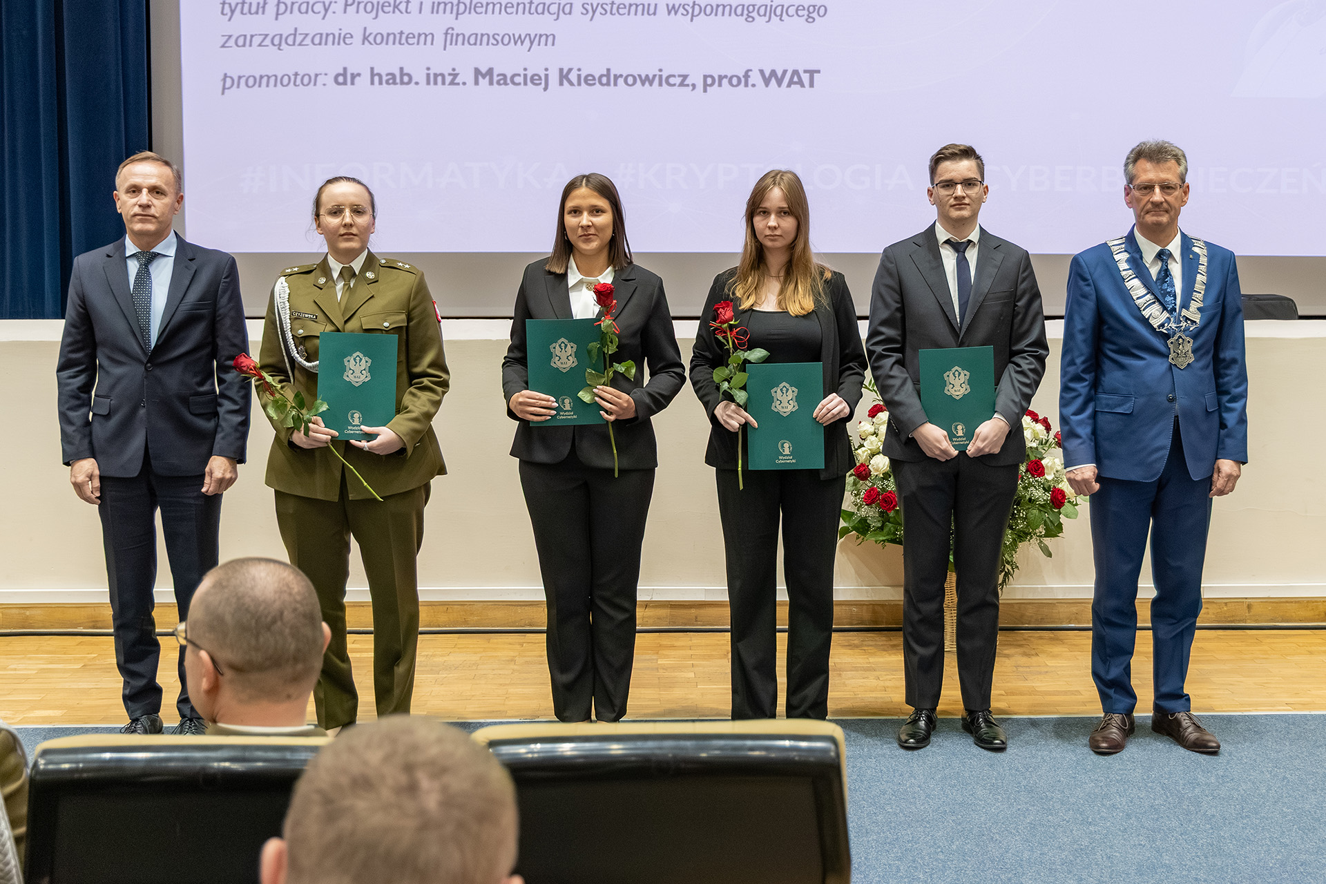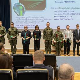 Wyróżnienia otrzymali również absolwenci studiów magisterskich, których prace zostały nagrodzone w konkursie Dziekana. Z kierunku kryptologia i cyberbezpieczeństwo wyróżniono ppor. mgr inż. Maję Czyżewską za pracę “Predykcja wartości wybranych instrumentów finansowych z wykorzystaniem uczenia głębokiego” napisaną pod kierunkiem promotora dr. inż. Romualda Hoffmanna, prof. WAT. Wyróżnienie otrzymał również ppor. mgr inż. Kamil Pociask za pracę “Metoda korekty położenia elementu roju dronów z wykorzystaniem sensorów UWB” napisaną pod opieką merytoryczną dr. hab. inż. Janusza Furtaka, prof. WAT. Z kierunku informatyka nagrodę otrzymał ppor. mgr inż. Patryk Podbielski za pracę “Algorytmy rozpoznawania obiektów i wyznaczania położenia na podstawie zdjęć na platformie mobilnej Android jako rozszerzenia systemu TAK” napisaną pod opieką gen. bryg. dr. inż. Mariusza Chmielewskiego oraz mgr inż. Wioletta Dziwińska za pracę “Metody rozpoznania manipulacji materiałem multimedialnym”, promotorem był płk dr inż. Rafał Kasprzyk.